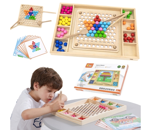 Drewniana gra "Złap i dopasuj" marki Viga. Zadanie dzieci jest nie tylko dopasowywać kolory według wzoru na papierze, ale także tworzyć więcej wzorów dzięki swojej wyobraźni. Ta gra może ćwiczyć koordynację ręka-oko i koncentrację dziecka. Dzieci mogą przymocować ulubiony papier do drewnianej tacy. Za pomocą pałeczek, łyżki lub spinacza przyczepić kulki do otworów na desce według wzorów i kolorów, a na koniec ułożyć je w piękny obrazek.
