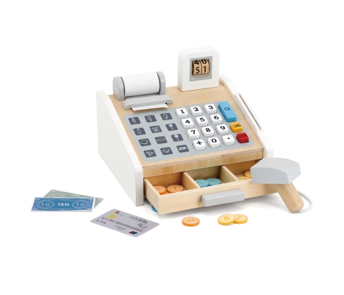 Kasa sklepowa to świetna drewniana zabawka, która pozwoli na odegranie wielu scenek, jakie mogą mieć miejsce w sklepie. Dzieci mogą wcielić się w role kasjera lub klienta oraz wspólnie ćwiczyć interakcje społeczne, oraz swoje zdolności komunikacyjne. Gotówka czy karta? Policz sumę należności, przyjmij pieniądze i wydaj poprawnie resztę. Kasa zawiera banknoty, monety, oraz kartę płatniczą. Dziecko może uczyć się bawiąc! Królowa Nauk - matematyka nie będzie już straszna.