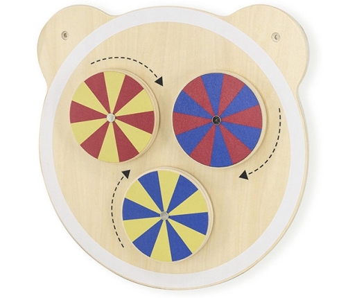 Jedna z serii drewnianych tablic z uroczą głową misia. Tablica z trzema kółkami, które zostały odpowiednio pomalowane, aby poprzez kręcenie wywoływać złudzenia optyczne. Zabawka pomaga w rozwijaniu logicznego myślenia u dzieci, pomaga również w nauce kolorów. Produkt idealnie sprawdzi się zarówno w domowym zaciszu, jak i w placówkach oświatowych, wczesnoszkolnych. Ciekawe przygotowanie formy tablicy z pewnością przykuje uwagę każdego malucha. Całość wykonana została z drewna lakierowanego i pomalowana nietoksycznymi farbami w żywe barwy, które zadowolą każdego użytkownika i dadzą mnóstwo radości z zabawy. Produkt przeznaczony dla dzieci od 18 miesiąca życia. W naszej ofercie dostępna jest cała seria tablic z głową misia.