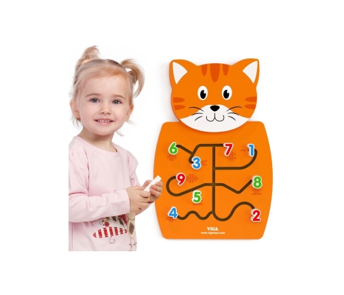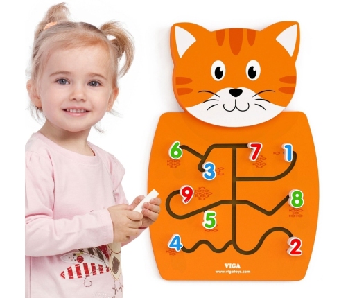 Edukacyjna Drewniana Gra manipulacyjna Kotek cenionego producenta zabawek Viga Toys dla dzieci od 18 miesiąca roku życia idealna do przedszkola jak i do domu.Zabawka posiada ścieżki, po których należy przesuwać cyferki, tak aby dopasować je do obrazków z odpowiednia ilością rybek. Taka gra wprowadzi Twoje dziecko w ekscytującą zabawę i pomoże poznać podstawy matematyki. To zalety, których nie zastąpi żadna inna zabawka. Kolorowa gra rozwija wyobraźnię i umiejętność logicznego myślenia. W myśl zasadom Montessori pomaga dziecku samemu połączyć ze sobą odpowiednie elementy ucząc przez zabawę.