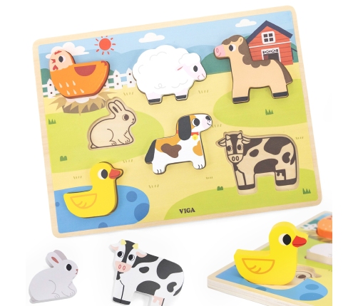 Drewniane Puzzle od marki VIGA w motywie farmy. W zestawie znajduje się kolorowa plansza oraz 7 elementów. Zabawa polega na dopasowaniu kafelków zwierzątek do odpowiednich miejsc na kolorowej podstawce, na której dla ułatwienia znajdziemy rysunki brakujących elementów. Taka zabawa pomoże kształtować precyzję ruchów rączek, oraz poprawić koordynację wzrokowo-ruchową, a także ćwiczyć pamięć, logiczne myślenie i koncentrację. Dzięki grubości elementów, puzzle mogą być wykorzystywane do innych zabaw jako figurki.