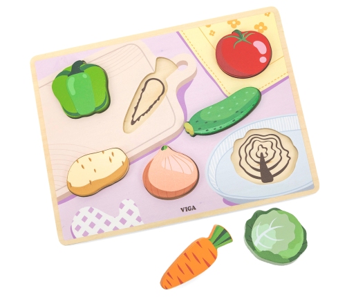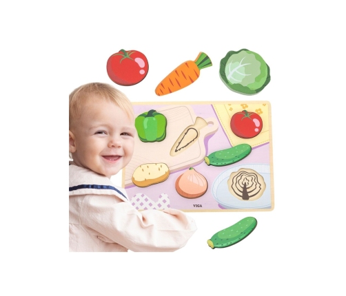 Drewniane Puzzle od marki VIGA w motywie warzyw. W zestawie znajduje się kolorowa plansza oraz 7 elementów. Zabawa polega na dopasowaniu kafelków warzyw do odpowiednich miejsc na kolorowej podstawce, na której dla ułatwienia znajdziemy rysunki brakujących elementów. Taka zabawa pomoże kształtować precyzję ruchów rączek, oraz poprawić koordynację wzrokowo-ruchową, a także ćwiczyć pamięć, logiczne myślenie i koncentrację. Dzięki grubości elementów, puzzle mogą być wykorzystywane do innych zabaw jako figurki.