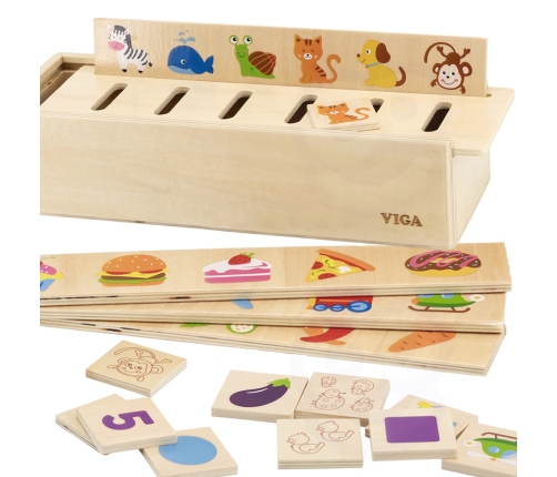 Drewniany Edukacyjny Sorter od renomowanej marki VIGA to idealna zabawka dla dzieci, które zaczynają poznawać świat. Ładne, z wysokiej jakości drewna pudełko posiada 6 przegródek na zdejmowanym wieczku, w które wrzuca się drewniane klocki z odpowiednią kategorią. Zestaw zawiera 4 długie deseczki oraz 48 sztuk drewnianych klocków z kategoriami warzyw, owoców, transportu, kształtów, zwierząt i liczb. Należy umieścić jedną z desek na wieczku, a następnie znaleźć pasujący obrazek, aby włożyć go do odpowiedniej przegródki. Dzięki tej zabawie twoje dziecko nauczy się podstawowych materiałów z życia codziennego i nauczy się je kategoryzować.