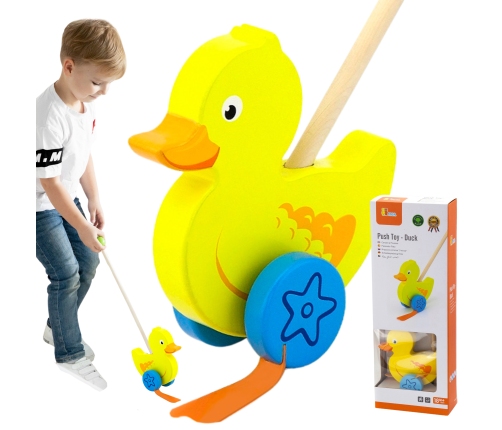 Pchacz z Kaczuszką na kijku od firmy Viga jest przeznaczony dla dzieci, które właśnie uczą się stawiać pierwsze kroki. Kolorowy pchacz zachęci maluszka do stawiania pierwszych kroków, będzie wdzięcznym towarzyszem spacerów w domu, ogrodzie oraz parku.