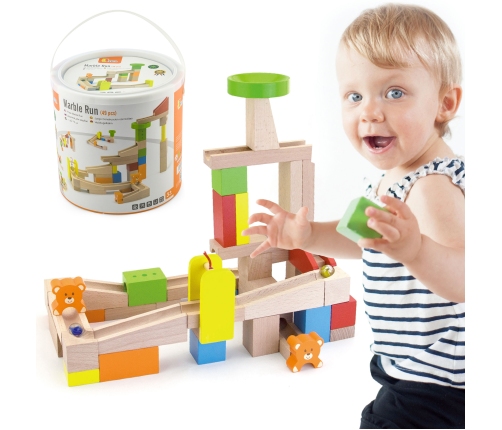 Budowla Kulodrom, składająca się z wysokiej jakości drewnianych, naturalnych bloczków, oferuje małym architektom wiele możliwości kreatywnej i odkrywczej oraz pomysłowej zabawy. W zestawie znajdują się 10 kart przedstawiających kombinacje ustawień kulodromu, o różnym poziomie trudności. Spróbujcie zbudować tor przedstawiony na karcie lub stwórzcie własną fantastyczną konstrukcje z 49-ciu elementów! Zestaw zawiera schodki i misie zapewniające dodatkową atrakcje dla twojej pociechy. Całość zapakowana w wygodne wiaderko z uchwytem, ułatwiające bezpieczne przechowywanie części oraz przenoszenie zabawki.