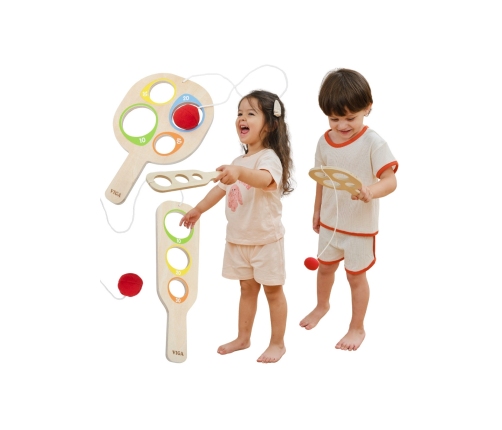 Wprowadź swoje dziecko w świat aktywnej zabawy z drewnianym Zestawem Paletek do Gry Złap Piłkę od VIGA! Ten unikalny zestaw zawiera dwie drewniane paletki o różnych, interesujących kształtach: jedną dłuższą i jedną kwadratową. Paletki posiadają otwory z oznaczeniem punktowym (10, 20, 30, 40, 50), co umożliwia rywalizację i zdobywanie punktów poprzez trafianie piłeczką. Zestaw zawiera dwie miękkie piłki-woreczki, które są solidnie przymocowane do paletek za pomocą sznurków, dzięki czemu są bezpieczne i niemożliwe do zgubienia. Zabawka rozwija u dziecka koordynację wzrokowo-ruchową, świadomość przestrzenną oraz umiejętność koncentracji i samoregulacji. Gra polega na zarzucaniu piłki tak, aby wpadła do jak najmniejszego otworu, co gwarantuje wyższy wynik i satysfakcję. To świetny sposób na spędzenie czasu na świeżym powietrzu lub w domu, zapewniając jednocześnie rozwój ruchowy i logiczne myślenie.