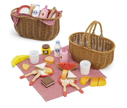 Wybierz się z przyjaciółmi na wesoły piknik z Drewnianym Zestawem Piknikowym od marki VIGA. Piękny koszyk wykonany ze sztucznej trzciny wypełniony jest drewnianym zestawem akcesoriów i tkaniną w kratę. Dzięki solidnym uchwytom Twoje dziecko z łatwością zabierze ze sobą cały zestaw, gdziekolwiek się uda. Zawarte w komplecie drewniane przekąski i akcesoria pozwolą na zabranie na piknik swoje ulubione zabawki, maskotki czy też odegranie scenki ze swoim przyjacielem. Zabawa z tym zestawem jest możliwa na świeżym powietrzu, jak i w domowym zaciszu. Część potraw składa się z kilku części i przymocowane są za pomocą rzepów. Za pomocą drewniane noża maluch może kroić je na kawałki, dzięki czemu rozwinie swoje zdolności motoryczne. Naśladowanie dorosłych przyczyni się za to do rozwoju umiejętności społecznych.