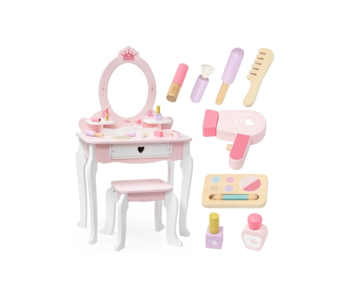 Duża Drewniana toaletka z marki Viga to wyjątkowa drewniana toaletka dla małej księżniczki, która spełni marzenia każdej dziewczynki! Wykonana z najwyższej jakości drewna, w delikatnych odcieniach różu i bieli, ta urocza toaletka zachwyca swoim bajkowym designem. Stylowe, zaokrąglone kształty, subtelne zdobienia i eleganckie nóżki sprawiają, że doskonale komponuje się w pokoju dziecięcym, dodając mu uroku i magii.Toaletka rozwija kreatywność, wyobraźnię i zachęca do odgrywania ról. Jest również doskonałym pomysłem na prezent – solidne wykonanie i estetyczny wygląd sprawią, że będzie służyć przez lata.