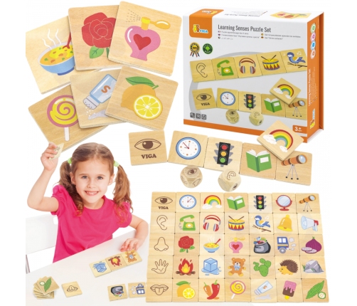 Drewniana układanka do nauki i sortowania zmysłów. Zadaniem dziecka jest przyporządkować przedmioty do wybranych zmysłów. Obrazki przedstawiają wiele przedmiotów codziennego użytku np. miś, samochód. Całość wykonana jest z drewna i pomalowana nietoksycznymi farbami. W dołączonej instrukcji propozycje wariantów dla jednej osoby jak i kilku osób oraz w zróżnicowanym poziomie trudności.