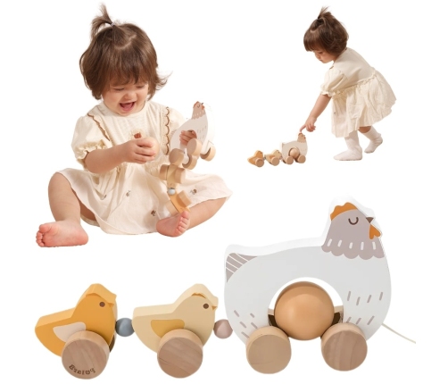 Ta urocza zabawka do ciągnięcia to doskonały towarzysz dla maluchów stawiających pierwsze kroki. Podczas poruszania się, pisklęta radośnie kołyszą się, a odłączane jajko obraca się, dostarczając dodatkowej frajdy. Zabawka nie tylko bawi, ale również wspiera rozwój koordynacji i zdolności motorycznych dziecka.
