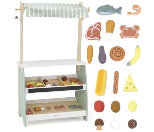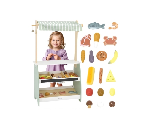 Drewniane Stoisko Targowe od marki VIGA pozwoli na wejście na wyższy poziom zabawy w odgrywanie roli sprzedawcy. Wykonany z solidnego drewna stragan pomalowany w pastelowe odcienie zieleni z pewnością zauroczy podopiecznych i stanie się ulubionym kącikiem zabaw. Znajdziemy w nim dwie półki, z czego wyższą podzieloną na trzy oddzielne przegródki, materiałowy daszek, małą tablicę kredową do opisania sprzedawanych przedmiotów i wpisania cen, a także malutki dzwoneczek do zwracania uwagi klientów. W zestawie z 18 artykułami spożywczymi, które nie pozwolą by ten stragan pozostał pusty.