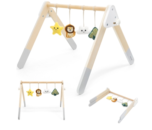 Stojak - Viga PolarB Baby Play Gym zalecany dla dzieci od pierwszego miesiąca życia. Jest idealny do pierwszych zabaw maluszka. Dzięki dołączonym interaktywnym zawieszkom stojak zachęca do zabawy, przez co stymuluje zmysły oraz mięśnie już od pierwszych dni życia.