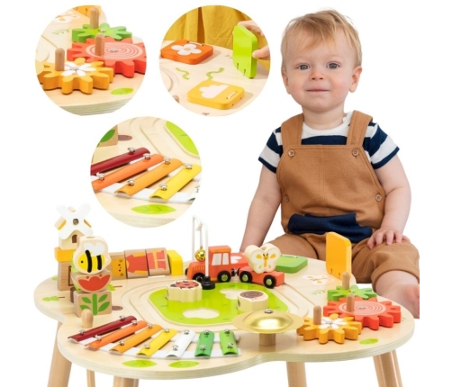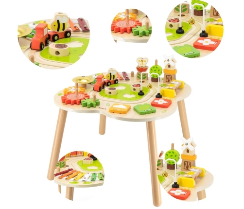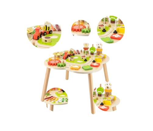 Drewniany stolik edukacyjny od firmy Viga to jedna z czołowych zabawek, która będzie służyła długo i zapewni Twojemu dziecku wiele lat ciekawej i kreatywnej zabawy. Stolik jest wystarczająco duży, aby kilkoro dzieci mogło bawić się jednocześnie. Kolorowy stół edukacyjny cieszy oko i zachęca do zabawy. Na stole zamontowane są koła zębate, cymbałki, dzwoneczek, piramidki, tor kolejowy oraz układanki. Całość została polakierowana i pomalowana bezpiecznymi dla dziecka farbami w żywe barwy, które zadowolą każdego użytkownika i dadzą mnóstwo radości z zabawy.
