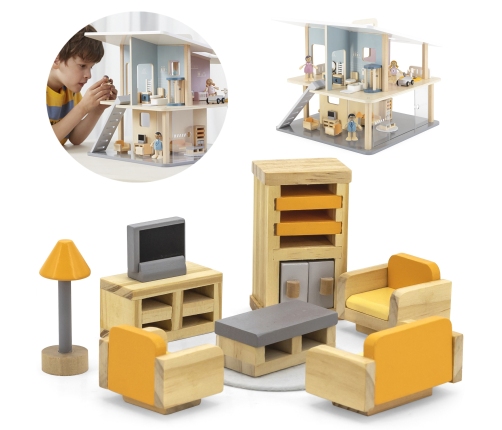Seria zestawu mebelków dla lalek od renomowanej firmy Viga to idealny prezent dla twojego dziecka. Seria zawiera 5 różnych pomieszczeń w innych kolorystykach. Stwórz swój własny domek dla lalek i układaj meble oraz pomieszczenia wedle własnego uznania. Produkt wykonany jest z wysokiej jakości materiału oraz z dużą dbałością o szczegóły. Zabawka pomalowana jest nietoksycznymi farbami w łagodnej kolorystyce.