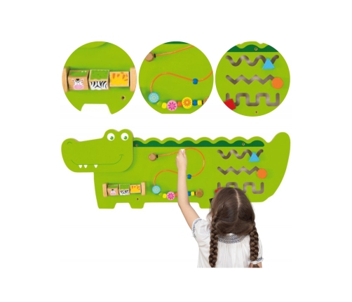 Tablica Sensoryczno-Manipulacyjna Krokodyl marki Viga Toys to drewniana, wielofunkcyjna zabawka na ścianę, która zapewni dzieciom godziny świetnej zabawy. Wśród różnych aktywności znajdziemy tutaj labirynt, przeplatankę (pętlę motoryczną z koralikami) oraz klocki. Zabawka została zaprojektowana tak, aby stymulować zmysły i wspierać rozwój motoryki dziecka. To doskonałe ćwiczenie zręczności małych paluszków. Zabawka uczy również logicznego myślenia oraz cierpliwości. Zabawki ścienne Viga sprawdzą się świetnie w żłobkach, przedszkolach, szkołach czy miejscach użyteczności publicznej. Mocowanie zabawki do ściany pozwala zaoszczędzić miejsce na podłodze.
