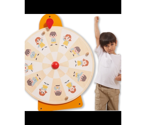Interaktywna zabawka marki Viga wykonana z drewna. Tablica przedstawia 12 dzieci o różnych wyrazach twarzy i czynnościach. Zakręć kołem i czekaj aż się zatrzyma. Czerwona strzałka wskaże dziecko, które należy naśladować. Zabawa pomaga dzieciom odkrywać różne emocje i ruchy ciała oraz uczyć umiejętności obserwacji i szybkiego reagowania. Świetne do zajęć w szkołach i innych placówkach.