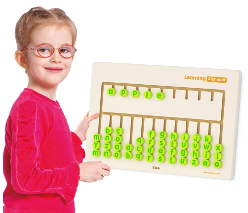 Nauka alfabetu Sensoryczna Tablica dla dzieci od lat 3 producenta Viga Toys. Sensoryczna tablica Nauka Alfabetu wprowadza dziecko w świat literek. Rozbudzą ciekawość i zachęcą do nauki czytania. Labirynt w którym zamieszkał cały alfabet, którego wesołe literki pomogą przy nauce literowania, sylabowania oraz czytania.