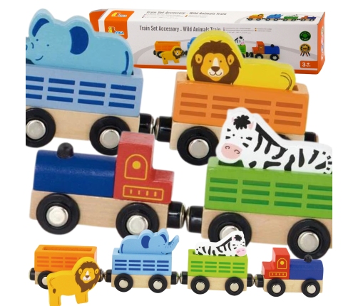 Drewniana kolejka to podstawowa zabawka każdego małego dziecka od 3 roku życia. Nieskończone możliwości sposobu zabawy powodują, że Twoje dziecko poświęca na nią dużo czasu. Drewniana figurka przedstawiająca pociąg z dzikimi zwierzętami. Składa się z 4 elementów łączących się ze sobą dzięki magnesowi. Zaprojektowany została przez cenionego producenta zabawek drewnianych firmę Viga Toys.