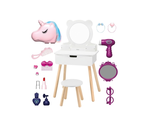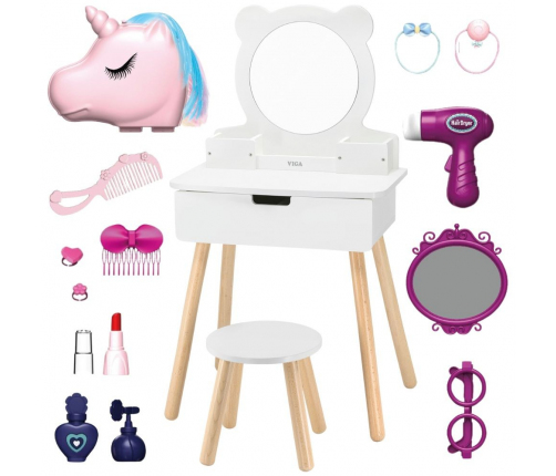 Duża, wolnostojąca biała toaletka + zestaw akcesoriów w pięknej torbie jednorożca od marki Viga to wymarzony komplet w pokoju każdej dziewczynki. Toaletka posiada wysuwaną szufladę, w której mała księżniczka może schować swoje skarby. Pod samym lustrem znajdują się przegródki na poręczne akcesoria. W zestawie znajdziemy również krzesełko do toaletki. W torebce jednorożca, znajdują się wszystkie niezbędne akcesoria jak z salonu piękności.