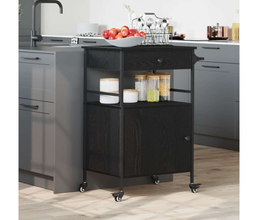 Šie virtuves ratiņi ir stilīgs un ērts risinājums uzglabāšanai un pārtikas gatavošanai jūsu virtuvē vai ēdamistabā. Gludā melna ozola apdare un moderns dizains izskatās lieliski, un nodrošina nepieciešamo funkcionalitāti ikdienas lietošanai un viesību rīkošanai.