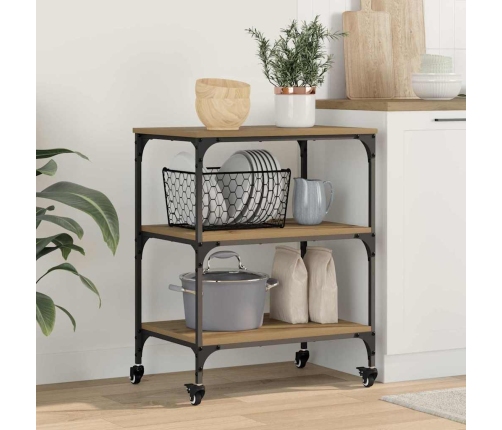 - Materiālu kombinācija: Ideāla kombinācija no inženierijas koka un tērauda padara šo ratiņu izturīgu un stilīgu. Koka virsma ir gluda, viegli kopjama, bet tērauda rāmis sniedz stabilitāti un uzsver industriālo izskatu.
