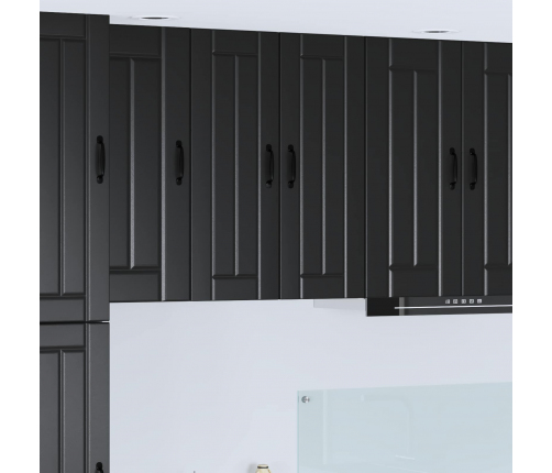 - Durvis ar eņģēm: Modernas durvis ar eņģēm nodrošina gludu funkcionalitāti un stilīgu izskatu. Melnie stieņi piešķir pievilcīgu kontrastu, kas papildina mūsdienīgu virtuvi.