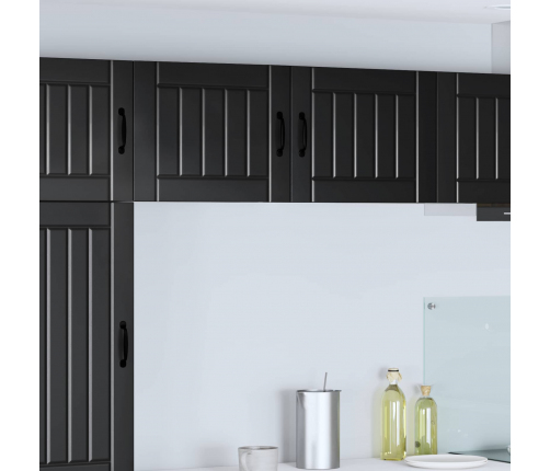 - Durvis ar eņģēm: Modernas durvis ar eņģēm nodrošina gludu funkcionalitāti un stilīgu izskatu. Melnie stieņi piešķir pievilcīgu kontrastu, kas papildina mūsdienīgu virtuvi.