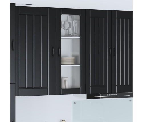 - Durvis ar eņģēm: Modernas durvis ar eņģēm nodrošina gludu funkcionalitāti un stilīgu izskatu. Melnie stieņi piešķir pievilcīgu kontrastu, kas papildina mūsdienīgu virtuvi.