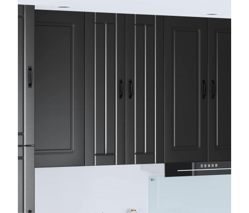 - Durvis ar eņģēm: Modernas durvis ar eņģēm nodrošina gludu funkcionalitāti un stilīgu izskatu. Melnie stieņi piešķir pievilcīgu kontrastu, kas papildina mūsdienīgu virtuvi.