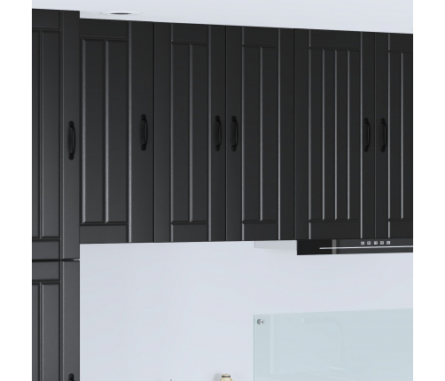 - Durvis ar eņģēm: Modernas durvis ar eņģēm nodrošina gludu funkcionalitāti un stilīgu izskatu. Melnie stieņi piešķir pievilcīgu kontrastu, kas papildina mūsdienīgu virtuvi.