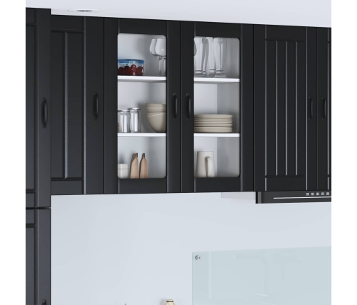 - Durvis ar eņģēm: Modernas durvis ar eņģēm nodrošina gludu funkcionalitāti un stilīgu izskatu. Melnie stieņi piešķir pievilcīgu kontrastu, kas papildina mūsdienīgu virtuvi.