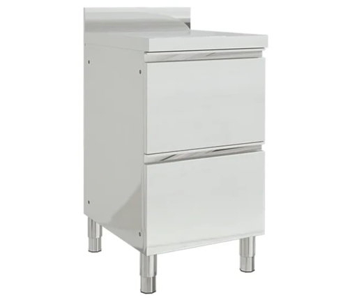 Skapītis ir izgatavots no kvalitatīva nerūsējošā tērauda, tādēļ tas ir izturīgs, noturīgs pret koroziju un viegli tīrāms. Tā 2 atvilktnes nodrošina pietiekami daudz vietas tīrīšanas aprīkojumam un piederumiem. Pateicoties regulējamām kājām, skapīti var pielāgot taisnā līmenī arī uz nelīdzenām grīdām. Tam ir 10 cm augsts sienas panelis un notekcaurules caurums.