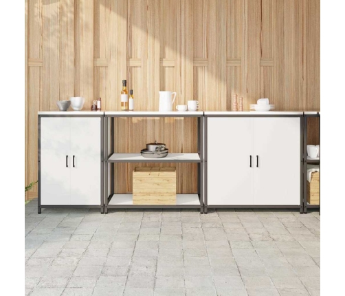 - Efektīvi uzglabāšanas risinājumi: Komplektā ir gan uzglabāšanas plaukti, gan skapji, ļaujot izveidot visaptverošu organizācijas sistēmu. Izgatavots ar metāla plauktiem un tērauda durvīm, šis komplekts ir ideāli piemērots virtuves būtiskajiem priekšmetiem, instrumentiem vai pārtikai, nodrošinot lielu jaudu bez stila upurēšanas.