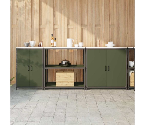 - Efektīvi uzglabāšanas risinājumi: Komplektā ir gan uzglabāšanas plaukti, gan skapji, ļaujot izveidot visaptverošu organizācijas sistēmu. Izgatavots ar metāla plauktiem un tērauda durvīm, šis komplekts ir ideāli piemērots virtuves būtiskajiem priekšmetiem, instrumentiem vai pārtikai, nodrošinot lielu jaudu bez stila upurēšanas.