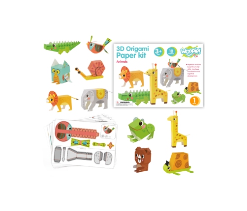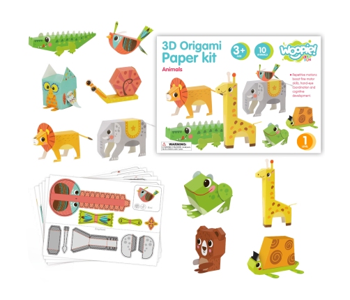 Zwierzątka Origami 3d od marki WOOPIE z serii ART&FUN daje nieskończone możliwości kreatywnej zabawy dla dziecka. Dziecko dzięki temu zestawowi kreatywnemu może stworzyć 10 papierowych zwierzaków origami 3D. Zestaw zawiera 5 kart, na których znajduję się po 2 zwierzaki. Zwierzaki są łatwe do wykonania wystarczy trochę zręczności i kleju. Nie potrzeba nożyczek, ponieważ elementy można łatwo wydzielić za pomocą rąk. Zwierzątkami dodatkowo można zachęcić dziecko do nauki angielskich nazw zwierząt. Zabawka rozwinie zdolności manualne dziecka tzw. "małą motorykę", koncentracje oraz wyobraźnie i kreatywność dziecka.