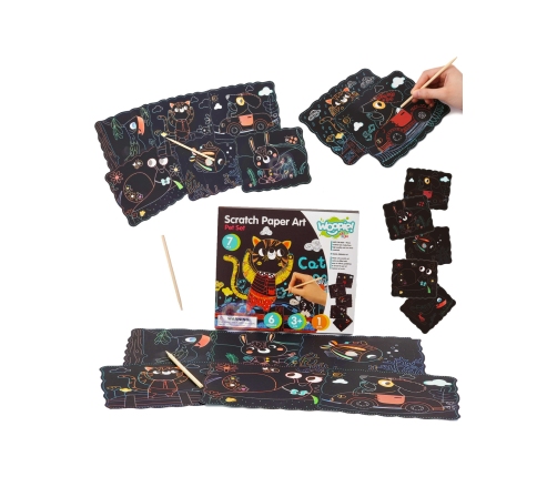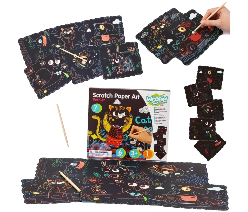 Rozbudź wyobraźnie dziecka magicznymi wydrapywankami od marki WOOPIE z serii ART&FUN! Za pomocą drewnianego rysika dziecko może wydrapywać, nowe formy/wzory zakryte na planszy i następnie obserwować jak kolory tworzą niezwykły, spójny obraz z motywem zwierząt! Zestaw zawiera 7 elementów, w tym 6 planszy do wydrapania oraz rysik. Plansze zawierają obrazy z kotem, psem, ślimakiem, królikiem, rybką oraz papugą. Dziecko można zabrać zestaw wszędzie dzięki wygodnemu opakowaniu z zamknięciem. Zabawka rozwija zdolności motoryczne dziecka oraz rozbudza kreatywność i wyobraźnie!