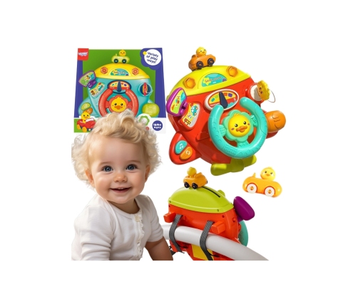 - - Ma wiele interaktywnych elementów: ruchomą kaczą kierownicę, kluczyk do uruchamiania, ruchomy prędkościomierz, lusterko boczne i ruchomy pojazd na górze zabawki.