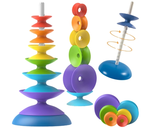 według własnych pomysłów. Zabawka świetnie nada się do ćwiczenia zdolności manualnych i motorycznych – dziecko doskonali chwyt, koordynację ręka–oko oraz rozpoznawanie kształtów i kolorów.