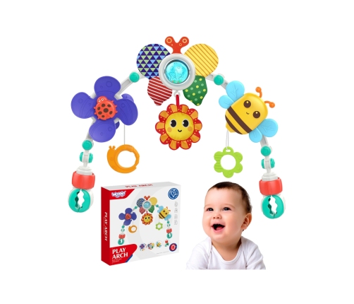 Pałąk Łuk z Zabawkami od marki WOOPIE to uniwersalna zabawka, która doda uroku i rozrywki każdemu wózkowi, fotelikowi czy łóżeczku. Jest niezwykle elastyczny, dzięki czemu bez problemu można go zamocować praktycznie wszędzie. Na pałąku znajdują się różne zabawki: wiatraczek z biedronką, które obraca się i drga po wprawieniu w ruch, słoneczko, które piszczy przy ściskaniu, grzechotka motylek z przeźroczystą kulą, w której skaczą kolorowe kuleczki oraz szeleszczący materiał, zawieszka ślimak i kwiatek, który może służyć jako gryzaczek. Każda z tych zabawek ma inną fakturę, co stymuluje zmysł dotyku dziecka i pomaga w rozwijaniu jego zdolności motorycznych.