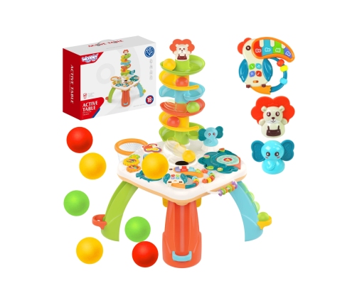 Stolik Edukacyjny Active Table od marki WOOPIE to zabawny i edukacyjny stolik dla maluchów, który zapewnia im godziny kreatywnej zabawy. Dzieci mogą bawić się kolorowymi kulkami i obserwować, jak kuleczki spadają po torze. Mogą też naciskać różne przyciski, które aktywują dźwięki i światła, i odkrywać nowe kształty, kolory i zwierzęta. Stolik ma również zabawki sensoryczne, takie jak grzechotka, lusterko i gryzak, które pobudzają zmysły dziecka. Active Table to idealny prezent dla dzieci, które lubią się uczyć przez zabawę.