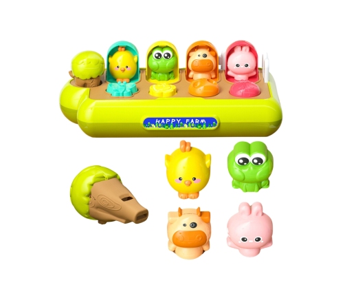 5 figurek zwierzątek wyskakuje przy użyciu odpowiadającego mu przyciskowi. Dziecko samo odkryje ciąg przyczynowo skutkowy, dlaczego dana figurka wyskoczyła.