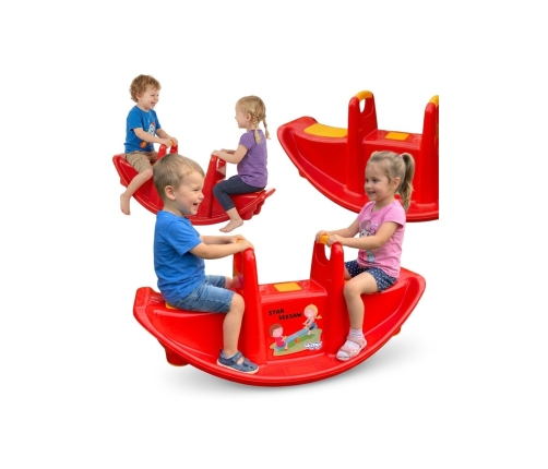Bujak Wieloosobowy STAR Czerwony marki Woopie jest prawdziwą gwiazdą wśród dzieci! Z bujaka może korzystać maksymalnie troje dzieci jednocześnie, a nawet jedno będzie się świetnie bawić. Gdy dzieci bujają się we dwójkę to dodatkowo rozwija u nich zdolności do współpracy. Bujaczek posiada specjalne nakładki antypoślizgowe na siedzisko oraz chroniące rączki. Bujak sam w sobie dostarcza wiele korzyści dla dzieci. Bujanie samo w sobie uspokaja dziecko oraz rozwija zdolności motoryczne ciała, co jest idealne dla prawidłowego rozwoju. Z huśtawki można korzystać zarówno w domu jak, i na zewnątrz!