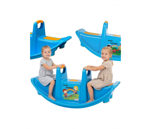 Bujak Wieloosobowy STAR Niebieski marki Woopie jest prawdziwą gwiazdą wśród dzieci! Z bujaka może korzystać maksymalnie troje dzieci jednocześnie, a nawet jedno będzie się świetnie bawić. Gdy dzieci bujają się we dwójkę to dodatkowo rozwija u nich zdolności do współpracy. Bujaczek posiada specjalne nakładki antypoślizgowe na siedzisko oraz chroniące rączki. Bujak sam w sobie dostarcza wiele korzyści dla dzieci. Bujanie samo w sobie uspokaja dziecko oraz rozwija zdolności motoryczne ciała, co jest idealne dla prawidłowego rozwoju. Z huśtawki można korzystać zarówno w domu jak, i na zewnątrz!