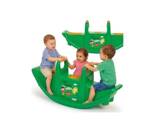 Dwumiejscowy zielony bujak marki Woopie zapewnia nie tylko mnóstwo radości, ale i wspiera rozwój fizyczny maluchów. Przeznaczony dla 1–2 dzieci, idealnie sprawdzi się zarówno w domu, jak i w ogrodzie. Jego ergonomiczny kształt, wygodne siedziska oraz uchwyty do trzymania gwarantują bezpieczną i komfortową zabawę przez długi czas. Produkt wykonano z trwałego, odpornego na warunki atmosferyczne tworzywa, które doskonale znosi intensywną eksploatację. To świetna alternatywa dla klasycznych huśtawek i bujaków – dziecko może się bawić samodzielnie lub w parze, ucząc się przy tym współpracy i równowagi. Lekka konstrukcja umożliwia łatwe przenoszenie produktu w dowolne miejsce. Intensywny zielony kolor w połączeniu z żółtymi akcentami oraz wesołym nadrukiem na froncie przyciągają uwagę dzieci i zachęcają do aktywnej zabawy! Bujanie się na tej huśtawce to nie tylko świetna rozrywka, ale i forma naturalnej gimnastyki, która pozytywnie wpływa na rozwój motoryki dużej, równowagi oraz koordynacji ruchowej.