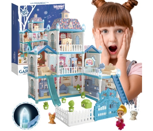 Odkryj magiczny świat zabawy z zestawem Domkiem dla Lalek od marki Woopie! Ten ogromny, trzypiętrowy pałac oferuje niezliczone możliwości kreatywnej zabawy. Zestaw zawiera aż 191 elementów, w tym uroczą lalkę, dwa zwierzątka (pieska i kotka), bogate wyposażenie wnętrz oraz piękne, świecące dekoracje , które sprawią, że zabawa nie skończy się po zmroku. Domek utrzymany jest w uroczej, niebiesko-różowej kolorystyce, inspirowanej zimowym ogrodem. Idealny na prezent, zachęca do odgrywania ról, rozwijając wyobraźnię i umiejętności społeczne.