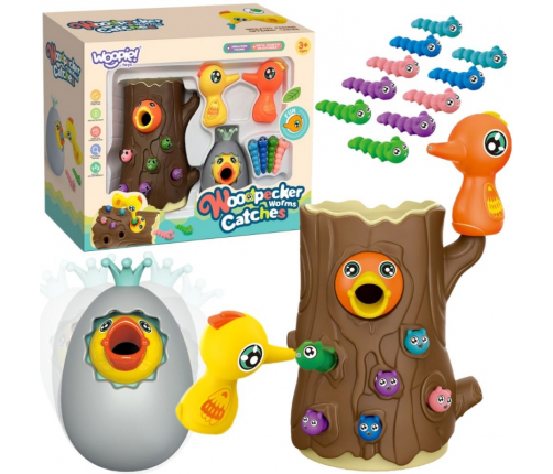 Gra Zręcznościowa Złap Robaczka od marki WOOPIE to doskonały sposób na wspólne spędzanie czasu z dzieckiem. Proste zasady oraz intuicyjna obsługa sprawiają, że zagrać w nią może praktycznie każdy. Zabawa polega na chwytaniu dzięciołem z magnesem robaczków ukrytych w otworkach znajdujących się w drzewie, a następnie na ich ponownym wkładaniu w dziób ptaszka. W zestawie oprócz mamy i taty dzięcioła do karmienia pisklaka, kłody z pisklakiem i 10 robaków, znajduję się jajko pisklak, który służyć może dodatkowo jako wańka wstańka do kołysania oraz skarbonka. Zestawem może się bawić jednocześnie dwoje dzieci. Gra uczy przez zabawę - pomoże rozwinąć m.in. umiejętności motoryczne (ruchowe) oraz wzrokowe. Zabawka jest sporym wyzwaniem dla malucha, wymaga skupienia uwagi oraz sprawności manualnej, ale przez to niezwykle zaciekawi dziecko.