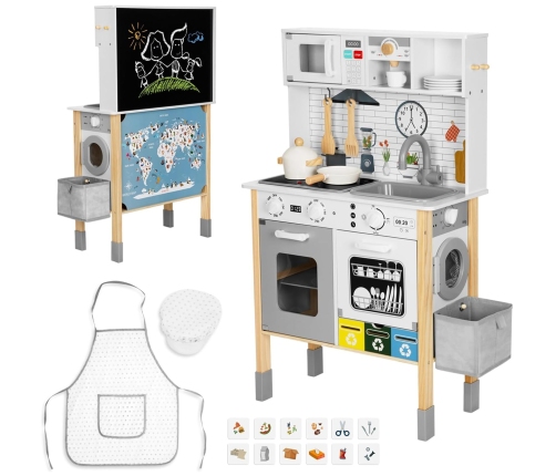 - W zestawie znajdują się liczne akcesoria: strój kucharza, garnki, talerze, kubek, przybory kuchenne, kosze z kartami do sortowania śmieci – wszystko, czego potrzeba do zabawy w prawdziwą kuchnię i dom.