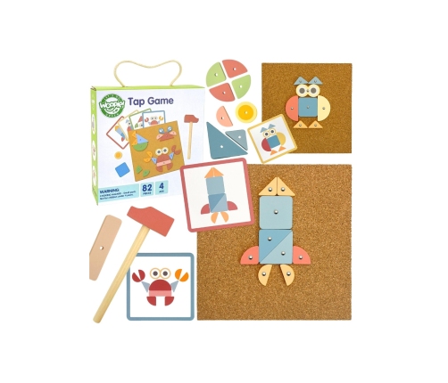 Przybijanka korkowa od marki WOOPIE z serii GREEN to idealna zabawka edukacyjna dla małego konstruktora. Zestaw zawiera 82 elementy, w tym: 30 klocków, 10 dwustronnych kart z 20 wzorami (3 poziomy trudności) do ułożenia i przybicia, 40 pinezek, tablice i młoteczek. W tej zabawie dzieci starają się odtworzyć obraz/układ z karty za pomocą przybijania odpowiednich klocków o różnym kształcie i kolorze np. obraz ptaka lub kwiatka. Każdy drewniany element posiada otwór i dziecko za pomocą pinesek bez problemu może wbić dowolny kształt do tablicy. Zabawę można urozmaicić o grę w zapamiętywanie i odtwarzanie z pamięci obrazka przez malucha. Dziecko może również wymyślić swój własny kształt/kontr - ogranicza tylko kreatywność i wyobraźnia. Zabawka rozwija zdolności manualne, logiczne myślenie, wyobraźnie i kreatywność, koncentracje oraz zapamiętywanie.