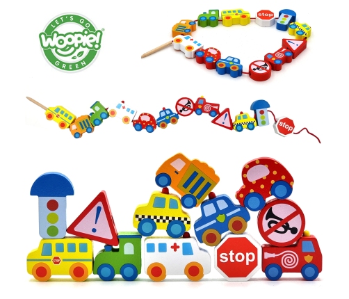 Klocki Koraliki Do Nawlekania Pojazdy Samochody od marki WOOPIE z serii GREEN to idealna zabawka do rozwijania umiejętności manualnych dziecka. Przeplatanka dla dzieci utrzymana została w motywie pojazdów. Nawlekanka to klasyczny zestaw drewnianych klocków z dziurkami, przez które dziecko przeplata sznureczek. Jest to świetna zabawa, która pobudza obszary w mózgu i rozwija zdolności manualne tzw. "małą motorykę", koordynację ręka-oko, wspomaga koncentrację oraz wzbudza ciekawość dziecka na temat pojazdów i znaków drogowych!
