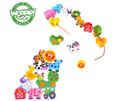 Klocki Koraliki Do Nawlekania Zwierzęta Farma od marki WOOPIE z serii GREEN to idealna zabawka do rozwijania umiejętności manualnych dziecka. Przeplatanka dla dzieci utrzymana została w motywie farmy. Nawlekanka to klasyczny zestaw drewnianych klocków z dziurkami, przez które dziecko przeplata sznureczek. Jest to świetna zabawa, która pobudza obszary w mózgu i rozwija zdolności manualne tzw. "małą motorykę", koordynację ręka-oko, wspomaga koncentrację oraz wzbudza ciekawość dziecka na temat wiejskiego życia na farmie!